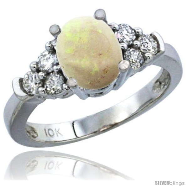 10K White Gold Natural Opal Ring Oval 9x7 Stone Diamond Accent
