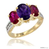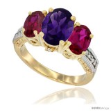 10K Yellow Gold Ladies 3-Stone Oval Natural Amethyst Ring with Ruby Sides Diamond Accent