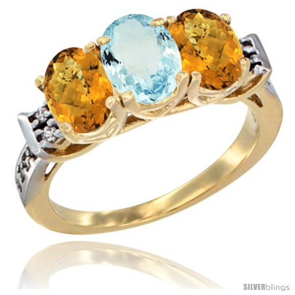 10K Yellow Gold Natural Aquamarine & Whisky Quartz Sides Ring 3-Stone Oval 7x5 mm Diamond Accent
