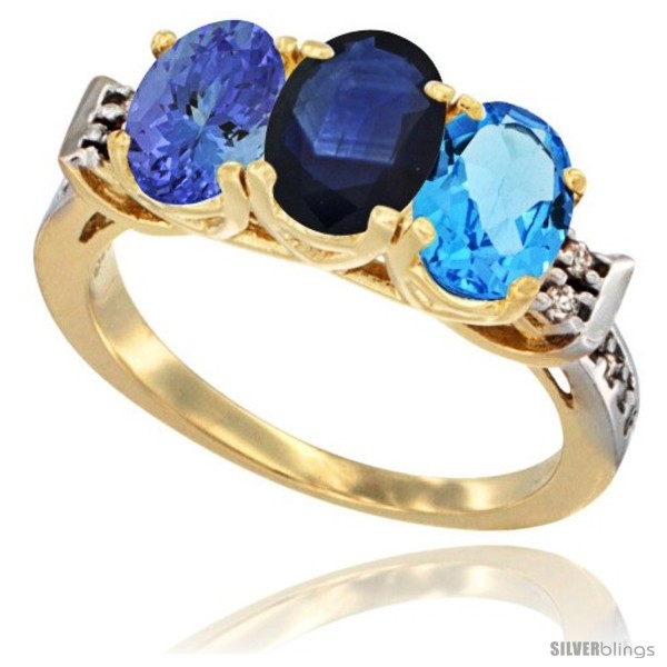 10K Yellow Gold Natural Swiss Blue Topaz, Blue Sapphire & Tanzanite Ring 3-Stone Oval 7x5 mm Diamond Accent