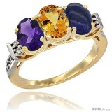 10K Yellow Gold Natural Amethyst, Citrine & Lapis Ring 3-Stone Oval 7x5 mm Diamond Accent