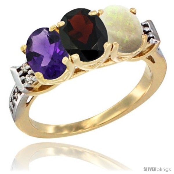 10K Yellow Gold Natural Amethyst, Garnet & Opal Ring 3-Stone Oval 7x5 mm Diamond Accent