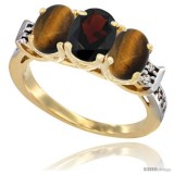 10K Yellow Gold Natural Garnet & Tiger Eye Sides Ring 3-Stone Oval 7x5 mm Diamond Accent
