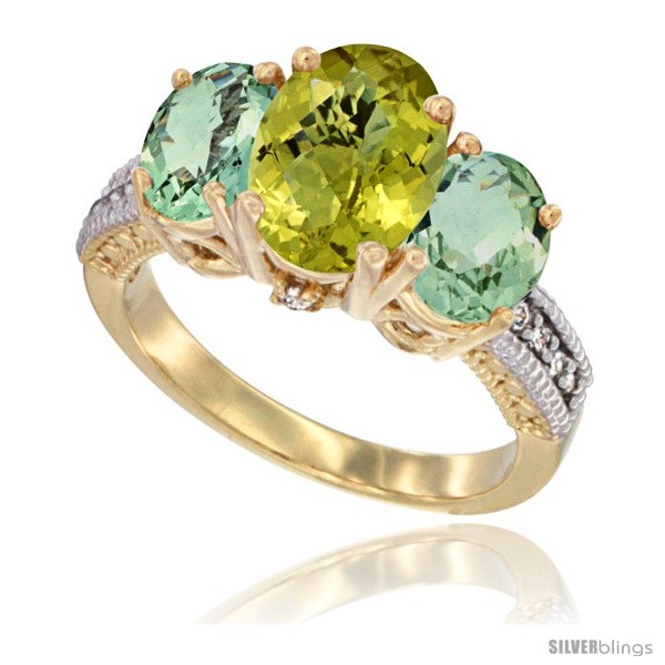 10K Yellow Gold Ladies 3-Stone Oval Natural Lemon Quartz Ring with Green Amethyst Sides Diamond Accent
