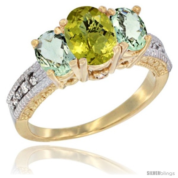 10K Yellow Gold Ladies Oval Natural Lemon Quartz 3-Stone Ring with Green Amethyst Sides Diamond Accent
