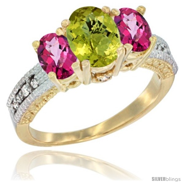 10K Yellow Gold Ladies Oval Natural Lemon Quartz 3-Stone Ring with Pink Topaz Sides Diamond Accent