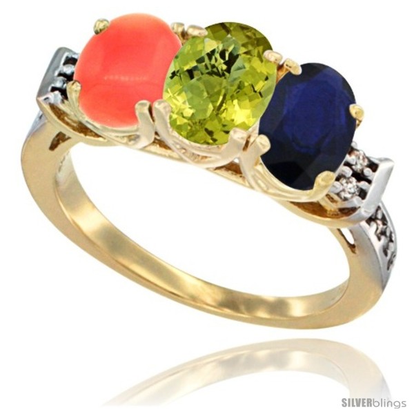 10K Yellow Gold Natural Blue Sapphire, Lemon Quartz & Coral Ring 3-Stone Oval 7x5 mm Diamond Accent