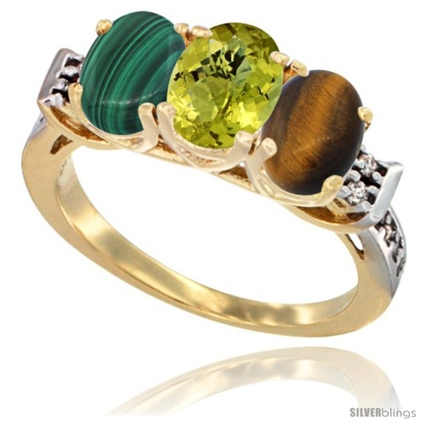 10K Yellow Gold Natural Tiger Eye, Lemon Quartz & Malachite Ring 3-Stone Oval 7x5 mm Diamond Accent