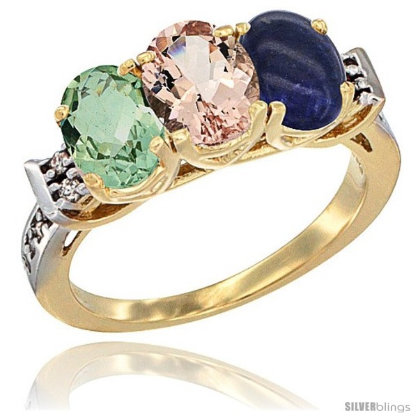 10K Yellow Gold Natural Green Amethyst, Morganite & Lapis Ring 3-Stone Oval 7x5 mm Diamond Accent