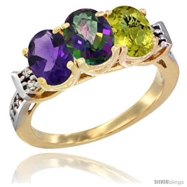 10K Yellow Gold Natural Amethyst, Mystic Topaz & Lemon Quartz Ring 3-Stone Oval 7x5 mm Diamond Accent