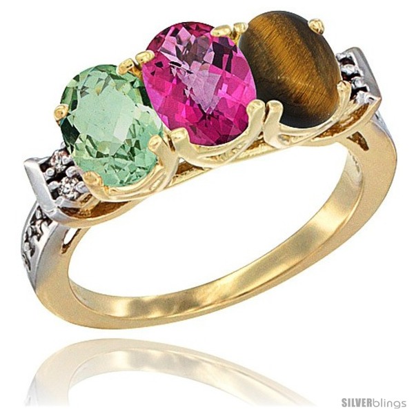 10K Yellow Gold Natural Green Amethyst, Pink Topaz & Tiger Eye Ring 3-Stone Oval 7x5 mm Diamond Accent