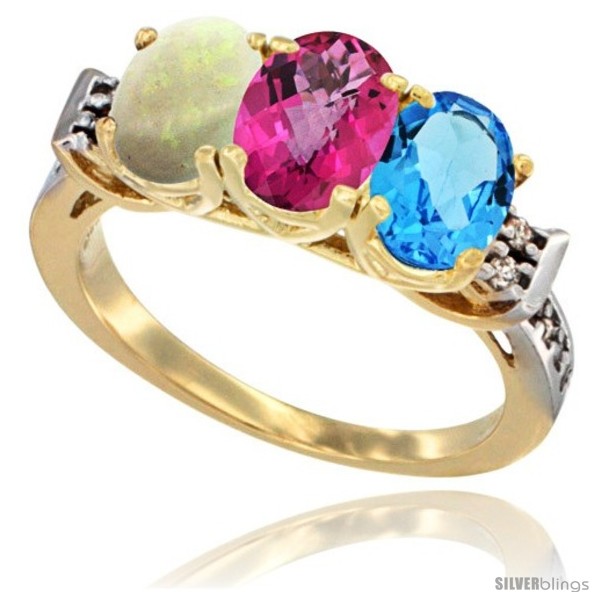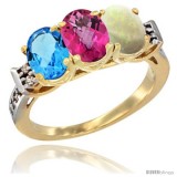 10K Yellow Gold Natural Swiss Blue Topaz, Pink Topaz & Opal Ring 3-Stone Oval 7x5 mm Diamond Accent
