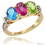 10K Yellow Gold Natural Swiss Blue Topaz, Pink Topaz & Peridot Ring 3-Stone Oval 7x5 mm Diamond Accent