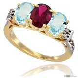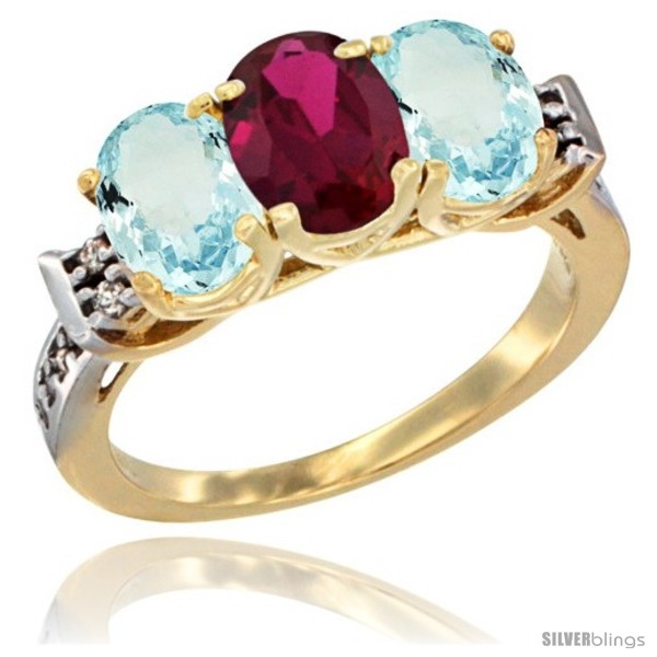 10K Yellow Gold Natural Ruby & Aquamarine Sides Ring 3-Stone Oval 7x5 mm Diamond Accent