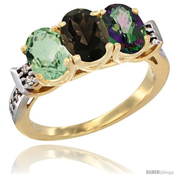 10K Yellow Gold Natural Green Amethyst, Smoky Topaz & Mystic Topaz Ring 3-Stone Oval 7x5 mm Diamond Accent