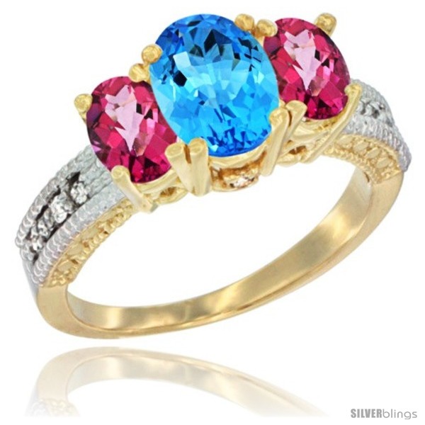 10K Yellow Gold Ladies Oval Natural Swiss Blue Topaz 3-Stone Ring with Pink Topaz Sides Diamond Accent
