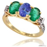 10K Yellow Gold Natural Tanzanite & Emerald Sides Ring 3-Stone Oval 7x5 mm Diamond Accent
