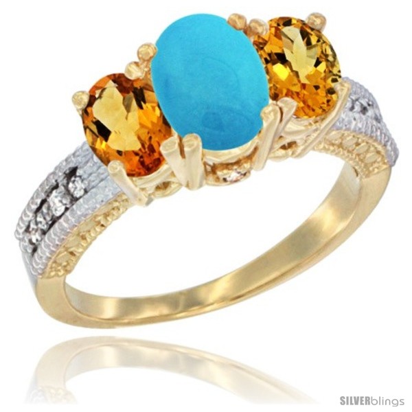 10K Yellow Gold Ladies Oval Natural Turquoise 3-Stone Ring with Citrine Sides Diamond Accent
