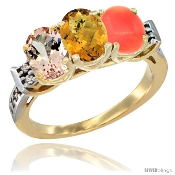 10K Yellow Gold Natural Morganite, Whisky Quartz & Coral Ring 3-Stone Oval 7x5 mm Diamond Accent