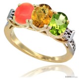10K Yellow Gold Natural Peridot, Whisky Quartz & Coral Ring 3-Stone Oval 7x5 mm Diamond Accent