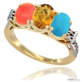 10K Yellow Gold Natural Turquoise, Whisky Quartz & Coral Ring 3-Stone Oval 7x5 mm Diamond Accent