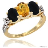 10K Yellow Gold Natural Whisky Quartz & Black Onyx Sides Ring 3-Stone Oval 7x5 mm Diamond Accent