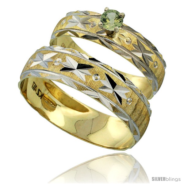 10k Gold 2-Piece 0.25 Carat Green Sapphire Ring Set (Engagement Ring & Man's Wedding Band) Diamond-cut Pattern -Style 10y506em
