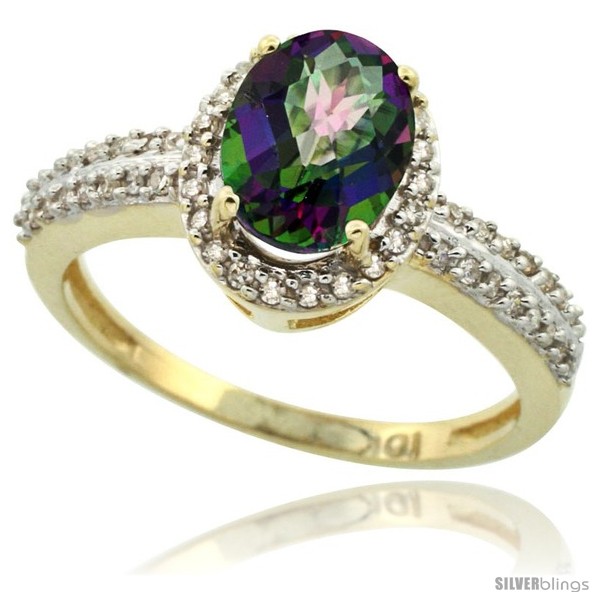 10k Yellow Gold Diamond Halo Mystic Topaz Ring 1.2 ct Oval Stone 8x6 mm, 3/8 in wide