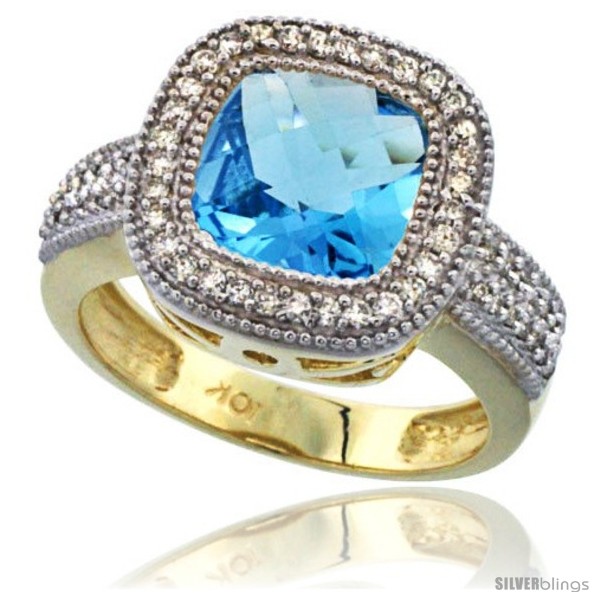 10K Yellow Gold Natural Swiss Blue Topaz Ring Cushion-cut 9x9 Stone Diamond Accent