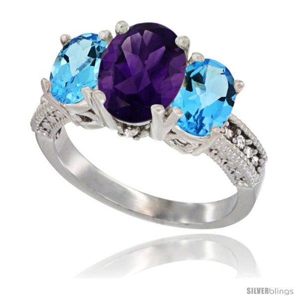 14K White Gold Ladies 3-Stone Oval Natural Amethyst Ring with Swiss Blue Topaz Sides Diamond Accent