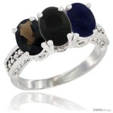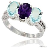 14K White Gold Natural Amethyst & Aquamarine Sides Ring 3-Stone Oval 7x5 mm Diamond Accent
