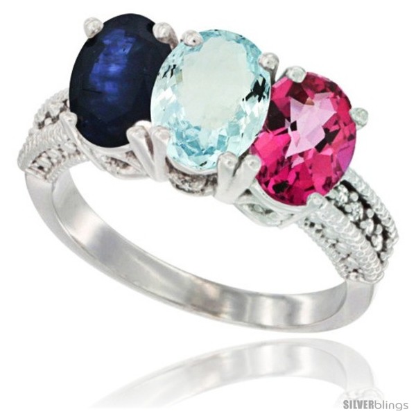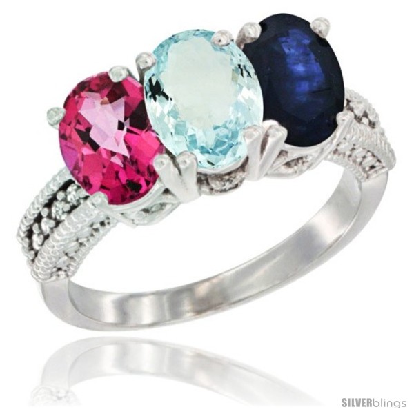 14K White Gold Natural Pink Topaz, Aquamarine & Blue Sapphire Ring 3-Stone 7x5 mm Oval Diamond Accent