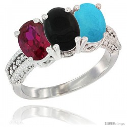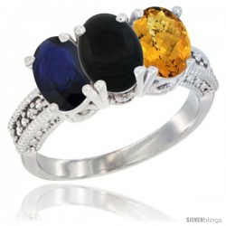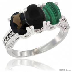 14K White Gold Natural Black Onyx Ring 3-Stone 7x5 mm Oval Diamond Accent