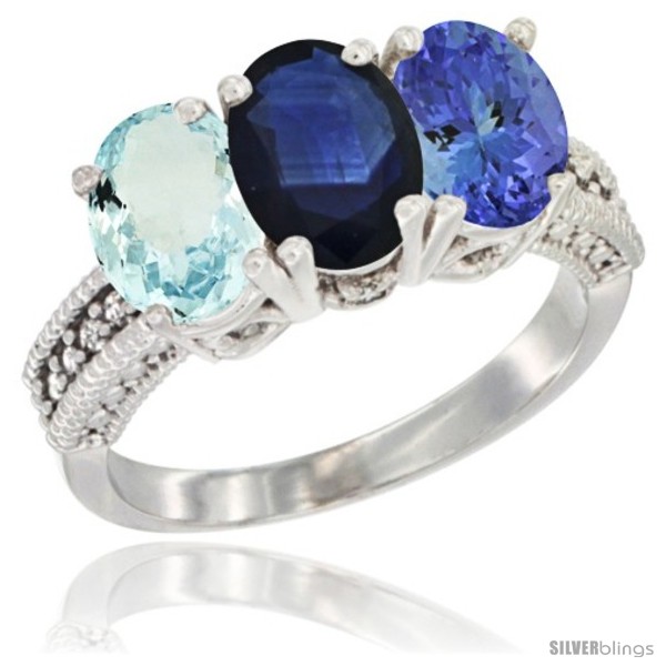 14K White Gold Natural Aquamarine, Blue Sapphire & Tanzanite Ring 3-Stone Oval 7x5 mm Diamond Accent