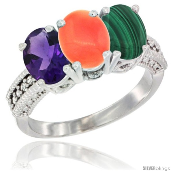 14K White Gold Natural Amethyst, Coral & Malachite Ring 3-Stone 7x5 mm Oval Diamond Accent