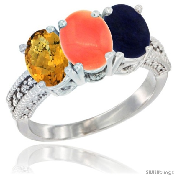 14K White Gold Natural Whisky Quartz, Coral Ring with Lapis Ring 3-Stone 7x5 mm Oval Diamond Accent