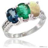 14K White Gold Natural London Blue Topaz, Emerald & Opal Ring 3-Stone 7x5 mm Oval Diamond Accent