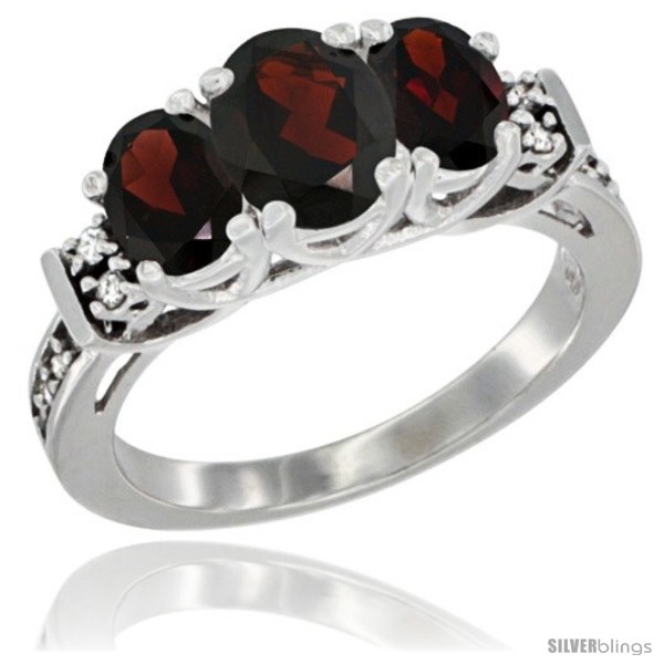 14K White Gold Natural Garnet Ring 3-Stone Oval with Diamond Accent