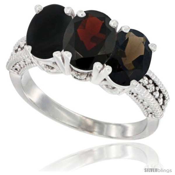 14K White Gold Natural Smoky Topaz, Garnet & Black Onyx Ring 3-Stone 7x5 mm Oval Diamond Accent
