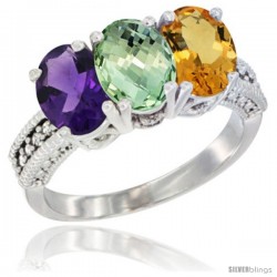 14K White Gold Ladies 3-Stone Oval Natural Green Amethyst Ring Diamond Accent