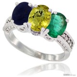 14K White Gold Natural Emerald, Lemon Quartz & Lapis Ring 3-Stone 7x5 mm Oval Diamond Accent