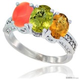 14K White Gold Natural Whisky Quartz, Lemon Quartz Ring with Coral Ring 3-Stone 7x5 mm Oval Diamond Accent