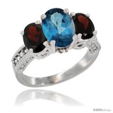 14K White Gold Ladies 3-Stone Oval Natural London Blue Topaz Ring with Garnet Sides Diamond Accent
