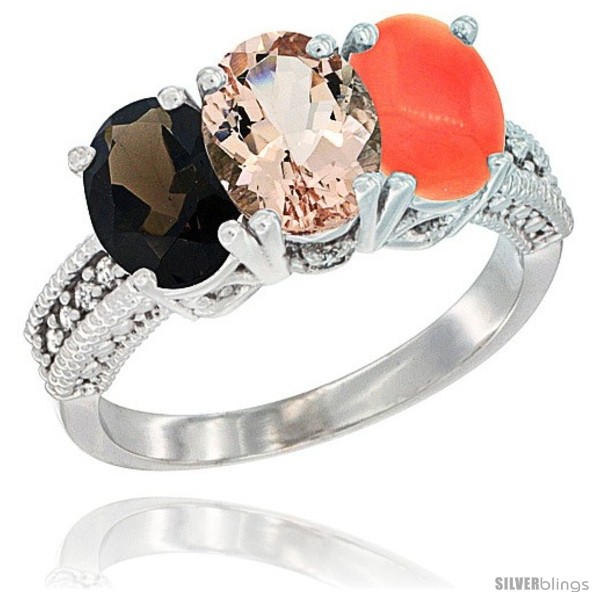 14K White Gold Natural Smoky Topaz, Morganite & Coral Ring 3-Stone 7x5 mm Oval Diamond Accent