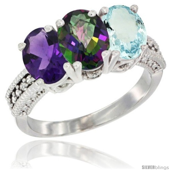 14K White Gold Natural Amethyst, Mystic Topaz & Aquamarine Ring 3-Stone 7x5 mm Oval Diamond Accent
