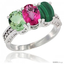 14K White Gold Natural Green Amethyst, Pink Topaz & Malachite Ring 3-Stone 7x5 mm Oval Diamond Accent
