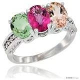 14K White Gold Natural Green Amethyst, Pink Topaz & Morganite Ring 3-Stone 7x5 mm Oval Diamond Accent
