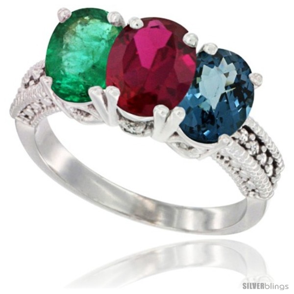 14K White Gold Natural London Blue Topaz, Ruby & Emerald Ring 3-Stone 7x5 mm Oval Diamond Accent