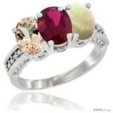 14K White Gold Natural Morganite, Ruby & Opal Ring 3-Stone Oval 7x5 mm Diamond Accent