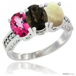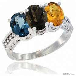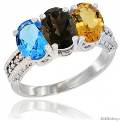 14K White Gold Ladies 3-Stone Oval Natural Smoky Topaz Ring with Blue Sapphire Sides Diamond Accent